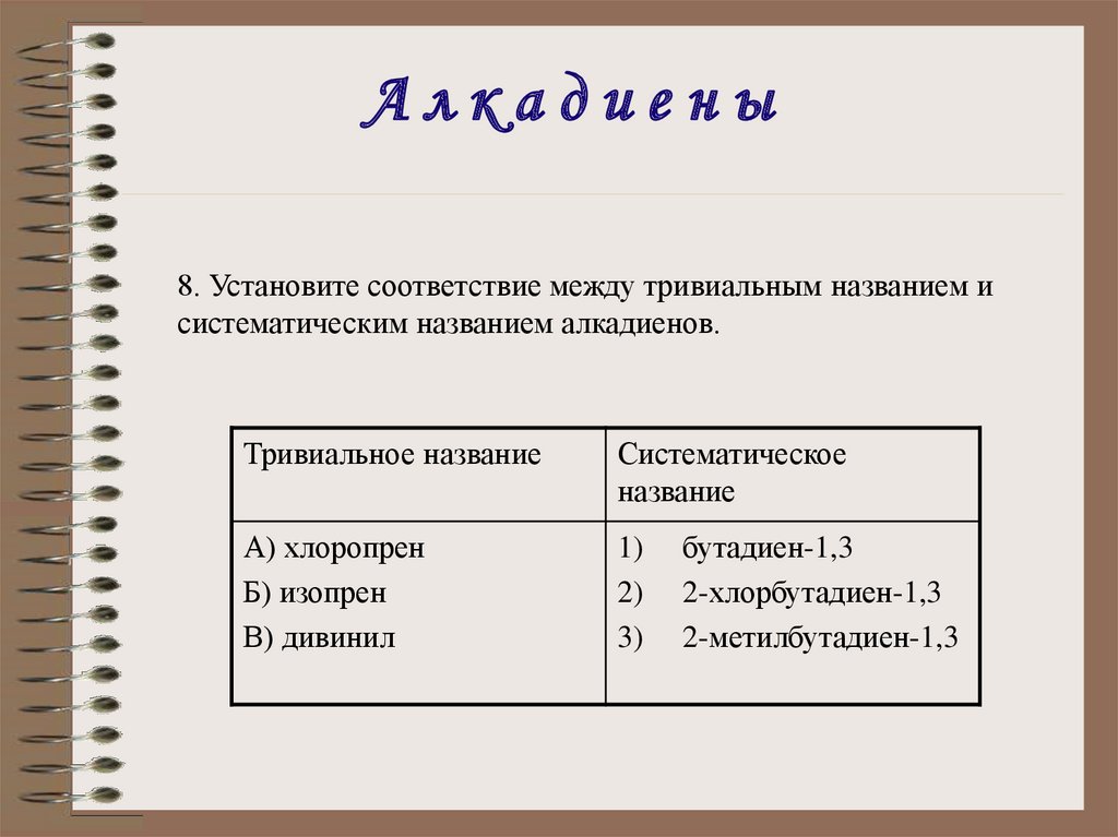 Алкадиены8. Установите соответствие между тривиальным названием и