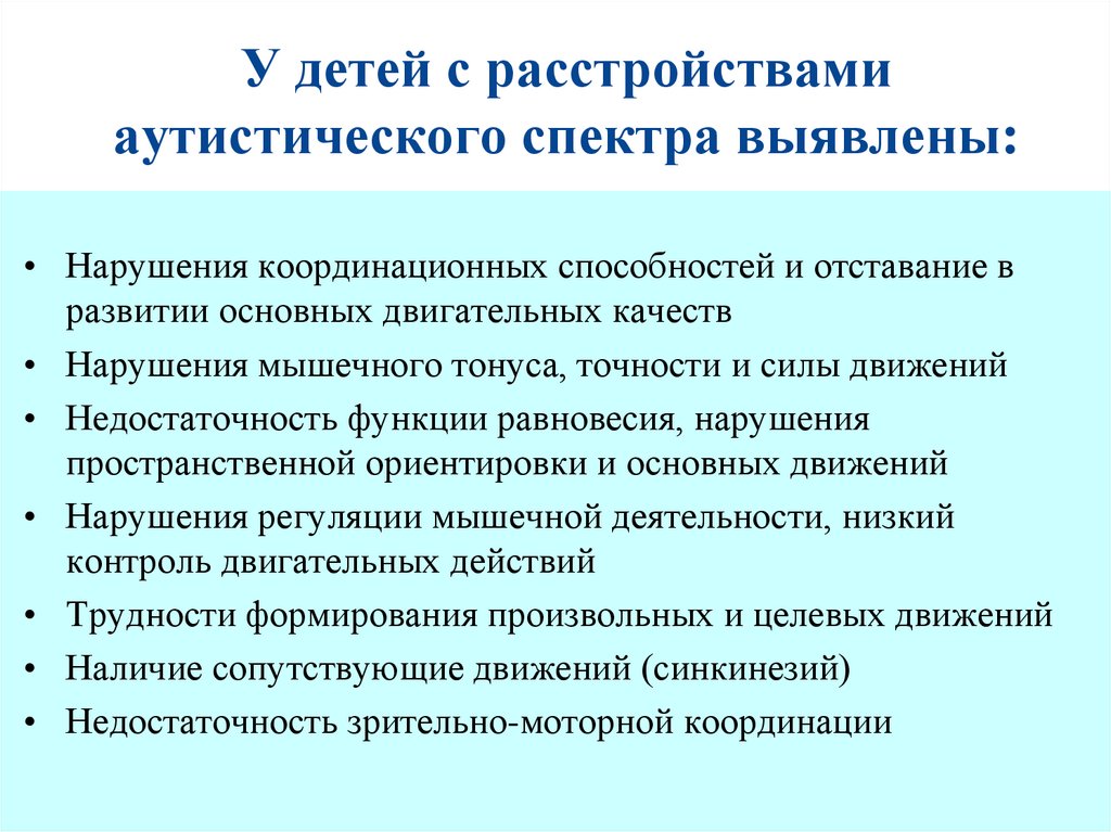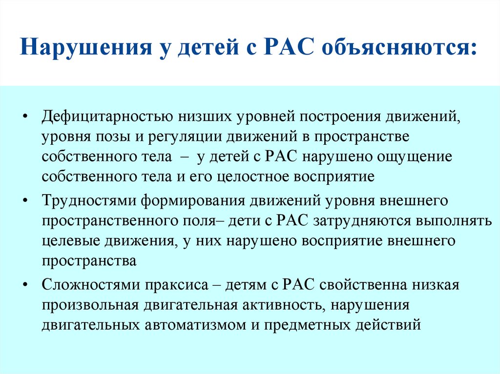 Нарушения у детей с РАС объясняются:• Дефицитарностью низших уровней построения движений,