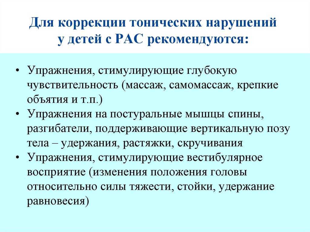 Для коррекции тонических нарушенийу детей с РАС рекомендуются: