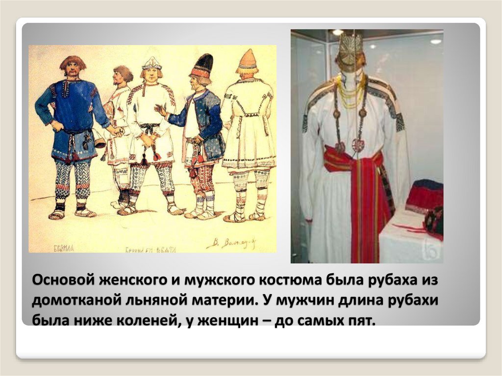 Основой женского и мужского костюма была рубаха издомотканой льняной материи. У мужчин длина рубахи