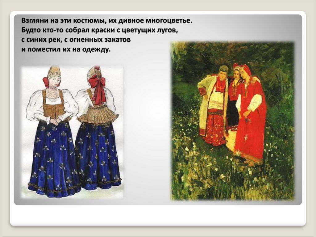 Взгляни на эти костюмы, их дивное многоцветье.Будто кто-то собрал краски с цветущих лугов,