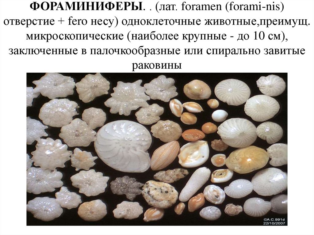 ФОРАМИНИФЕРЫ. . (лат. foramen (forami-nis)отверстие + fero несу) одноклеточные животные,преимущ.