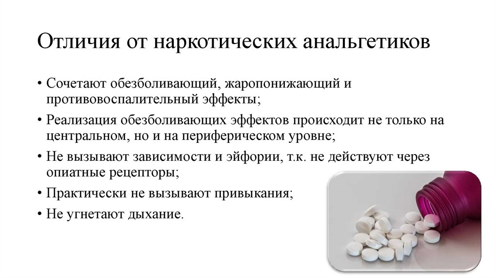 Отличия от наркотических анальгетиков• Сочетают обезболивающий, жаропонижающий и