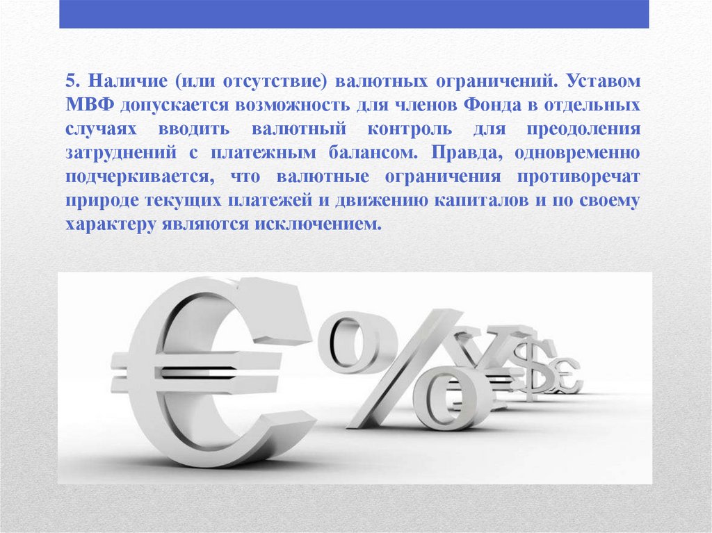 5. Наличие (или отсутствие) валютных ограничений. УставомМВФ допускается возможность для членов Фонда в отдельных