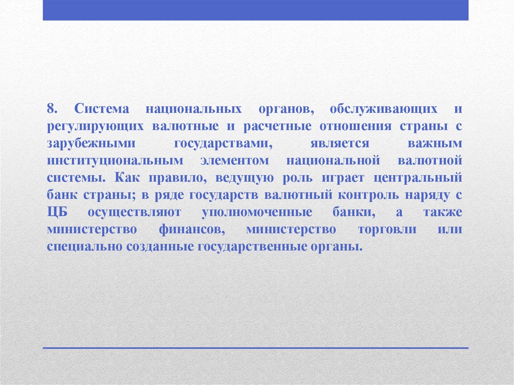 8. Система национальных органов, обслуживающих ирегулирующих валютные и расчетные отношения страны с