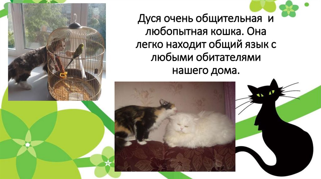 Дуся очень общительная илюбопытная кошка. Она