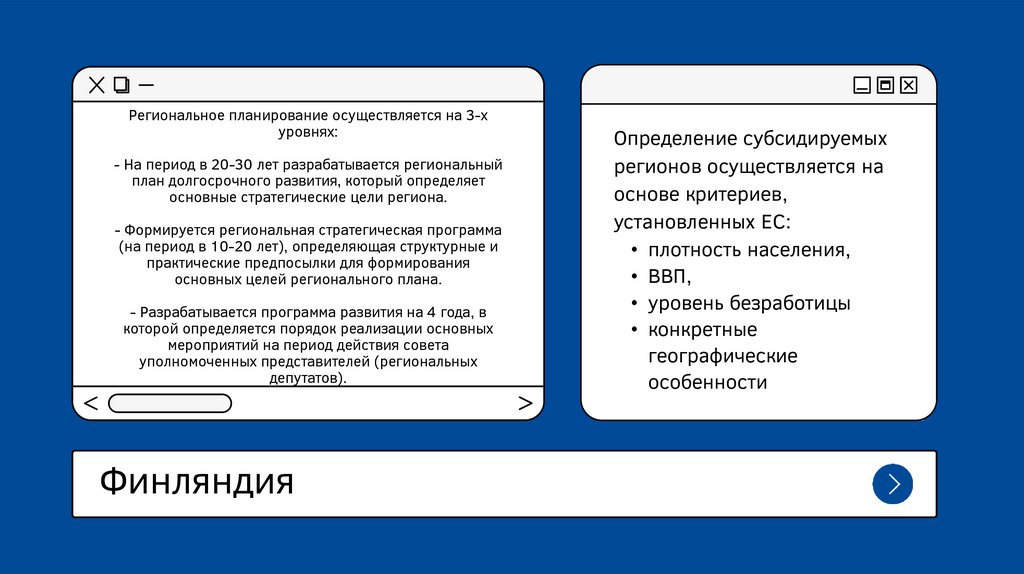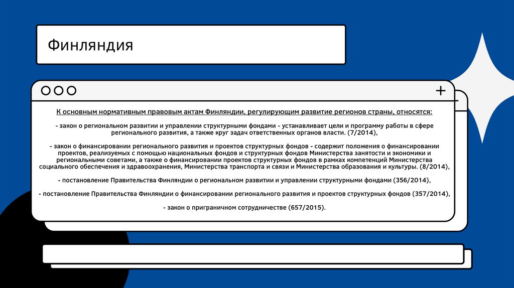 ФинляндияК основным нормативным правовым актам Финляндии, регулирующим развитие регионов страны, относятся: