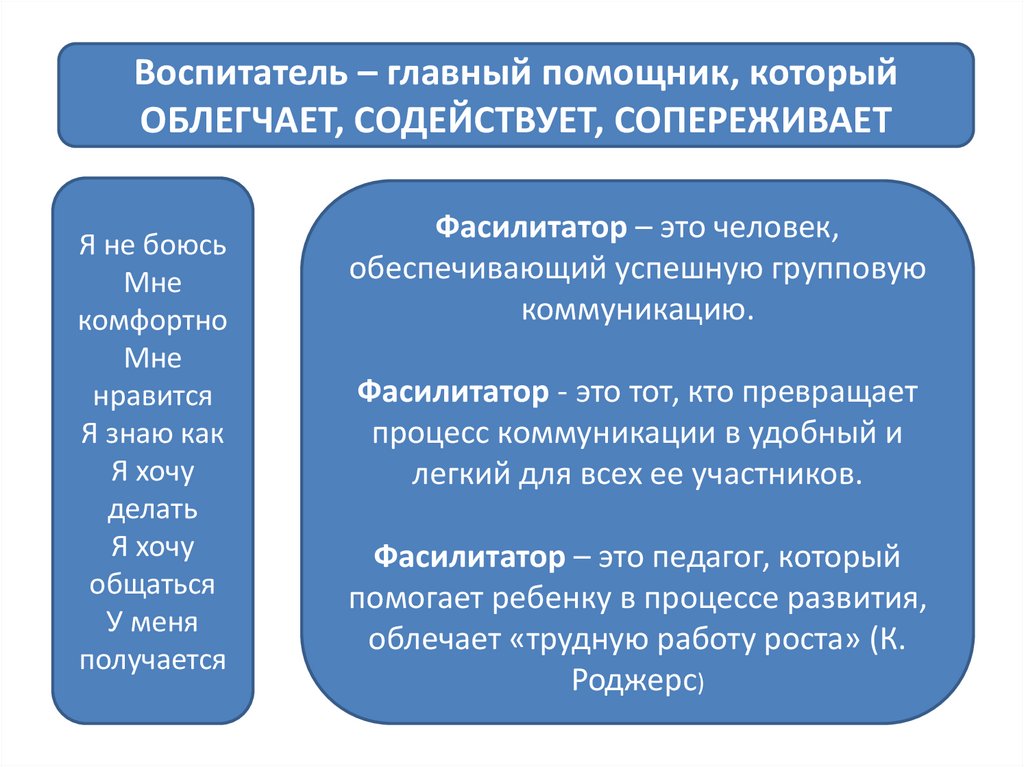 Воспитатель – главный помощник, которыйОБЛЕГЧАЕТ, СОДЕЙСТВУЕТ, СОПЕРЕЖИВАЕТ