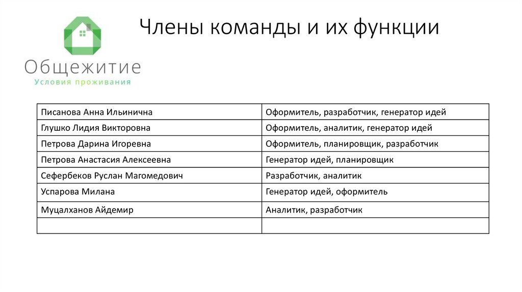 Члены команды и их функцииПисанова Анна Ильинична