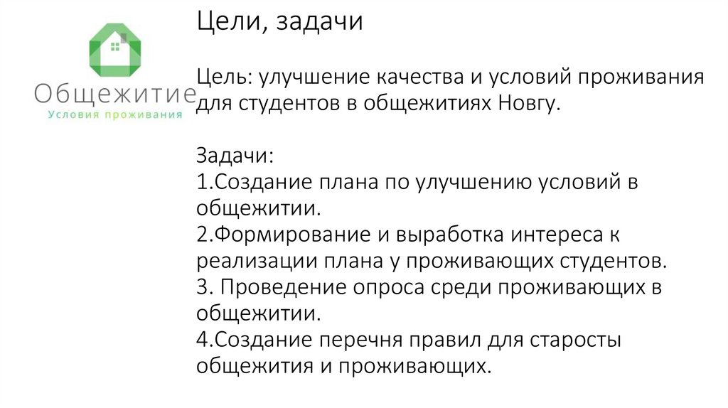 Цели, задачиЦель: улучшение качества и условий проживания