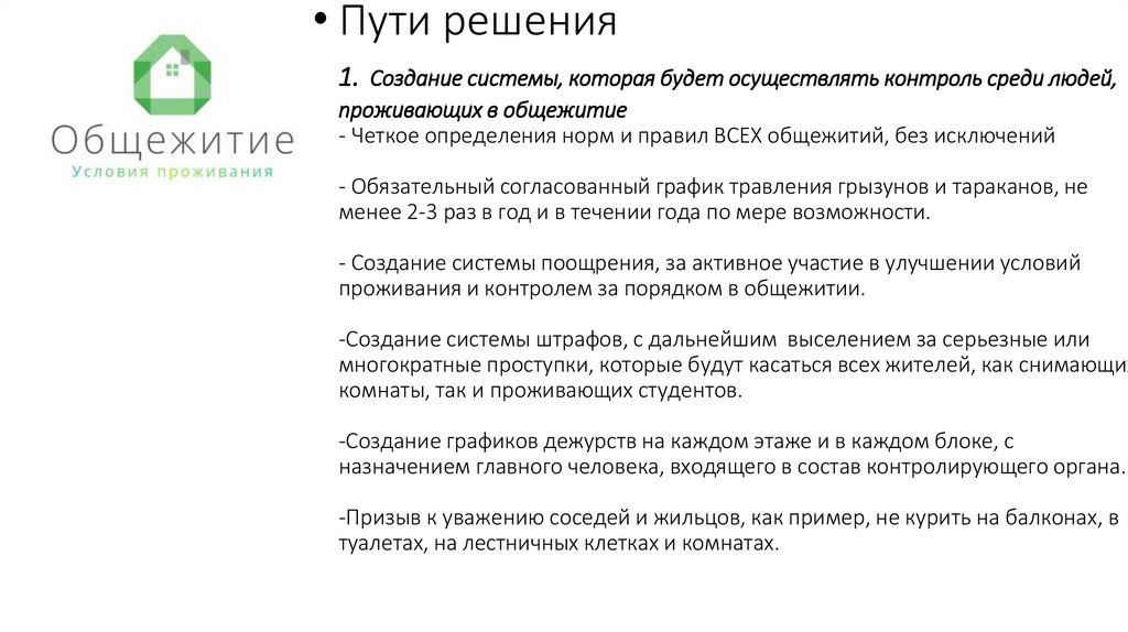 - Четкое определения норм и правил ВСЕХ общежитий, без исключений