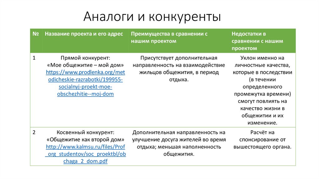 Аналоги и конкуренты№ Название проекта и его адрес