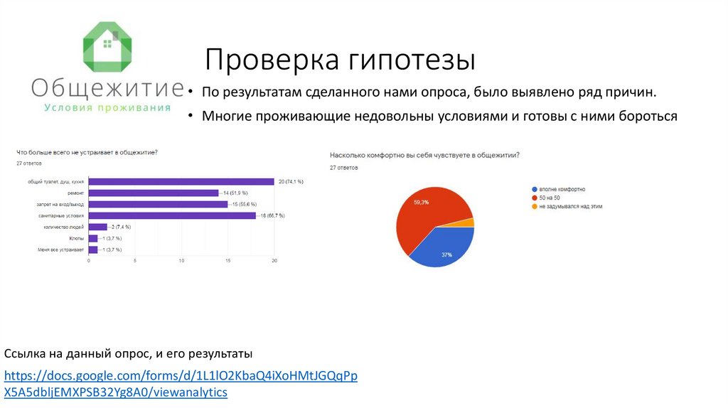 Гипотеза• Большинство проживающих не довольны условиями в общежитии.