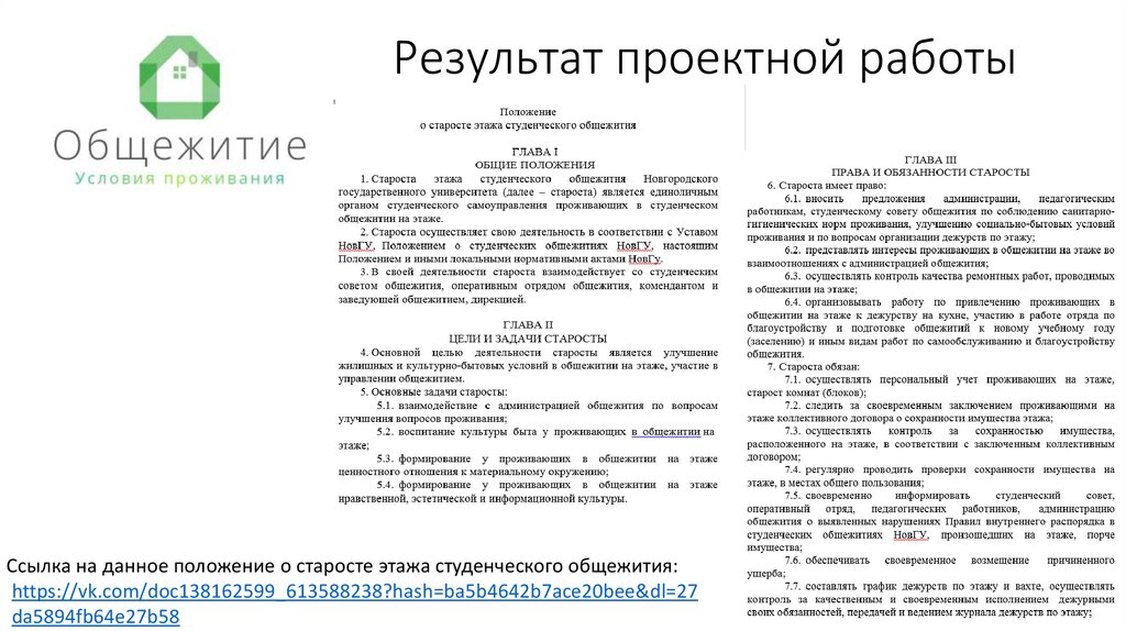 Результат проектной работыСсылка на данное положение о старосте этажа студенческого общежития: