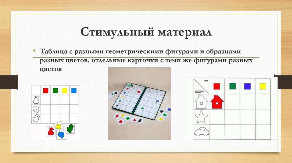 Стимульный материал• Таблица с разными геометрическими фигурами и образцами