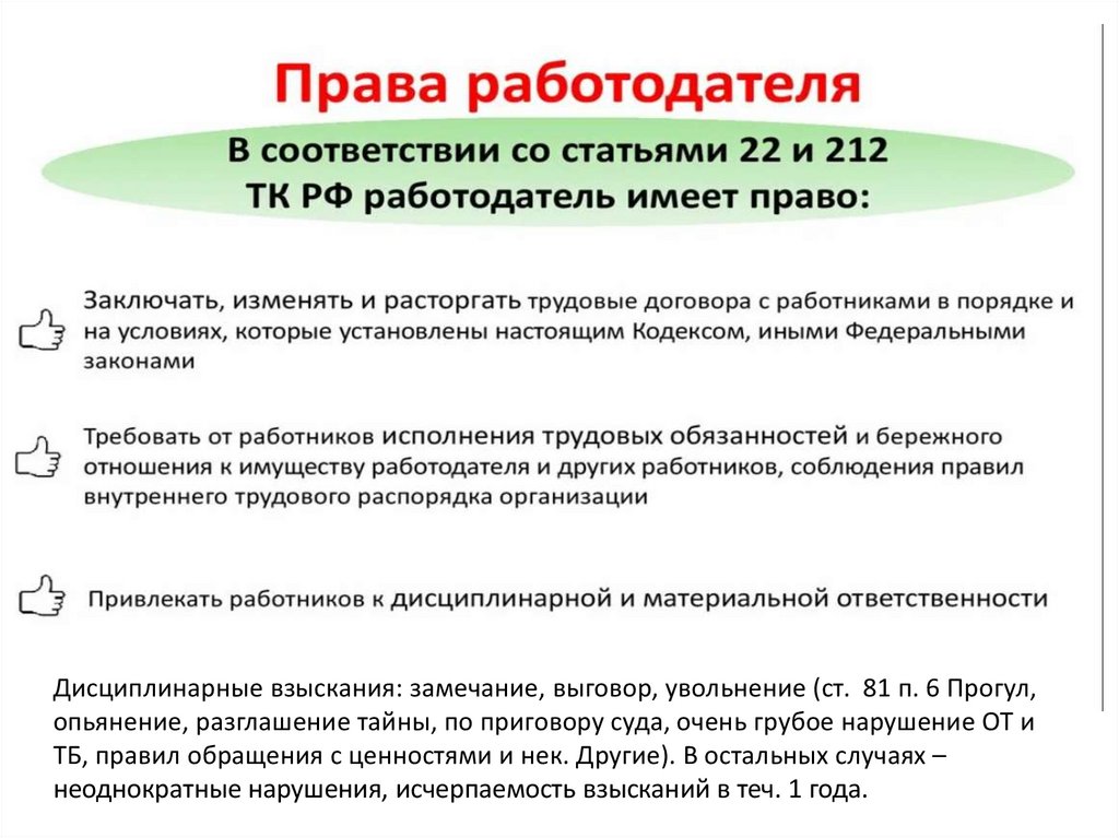 Дисциплинарные взыскания: замечание, выговор, увольнение (ст. 81 п. 6 Прогул,опьянение, разглашение тайны, по приговору суда, очень грубое нарушение ОТ и