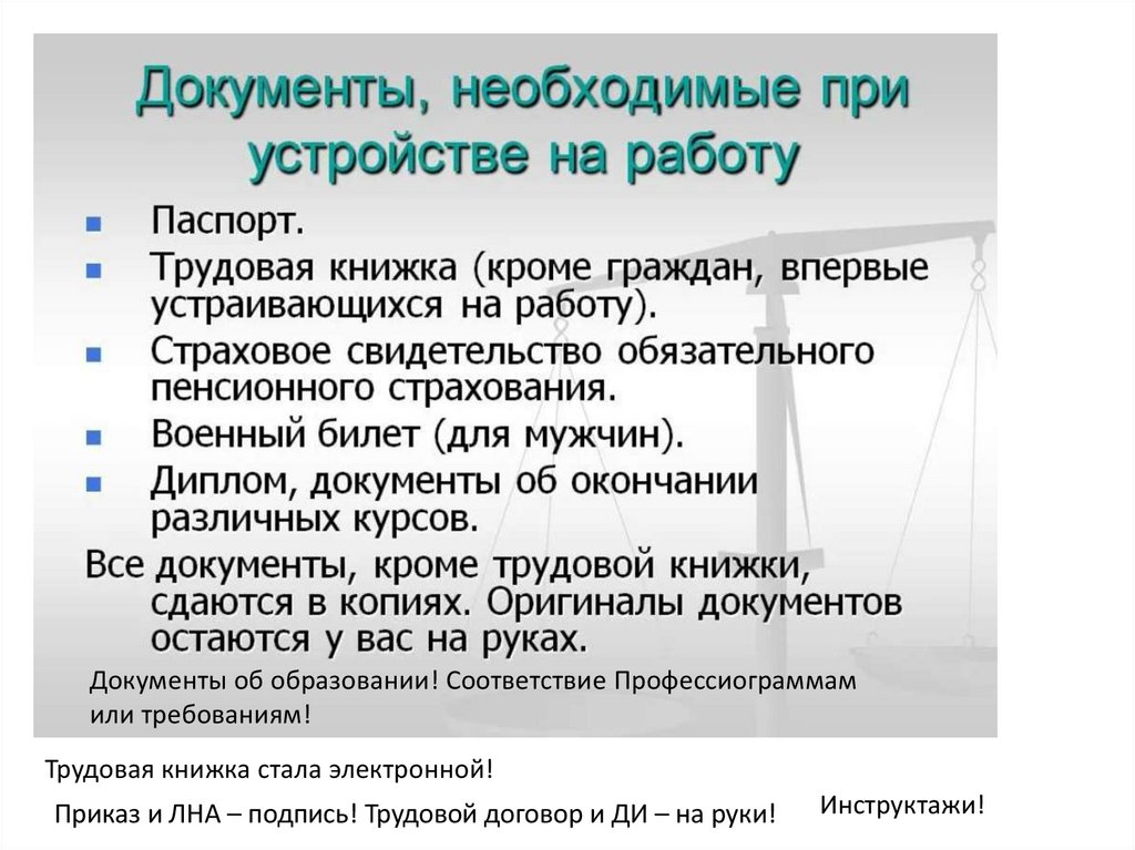 • Перечислить документы для трудоустройства.