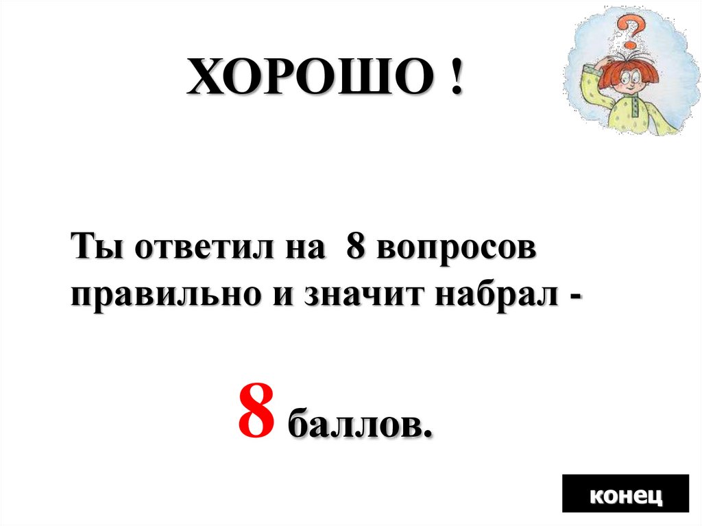 ХОРОШО !Ты ответил на 8 вопросов