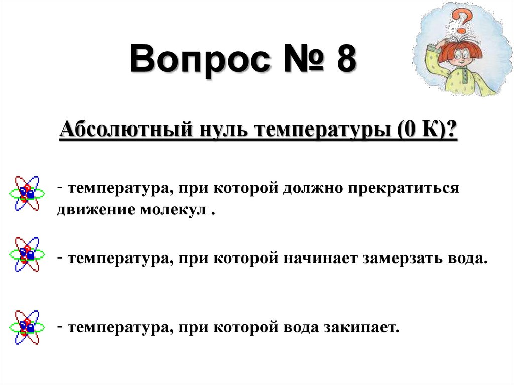 Вопрос № 8Абсолютный нуль температуры (0 К)?