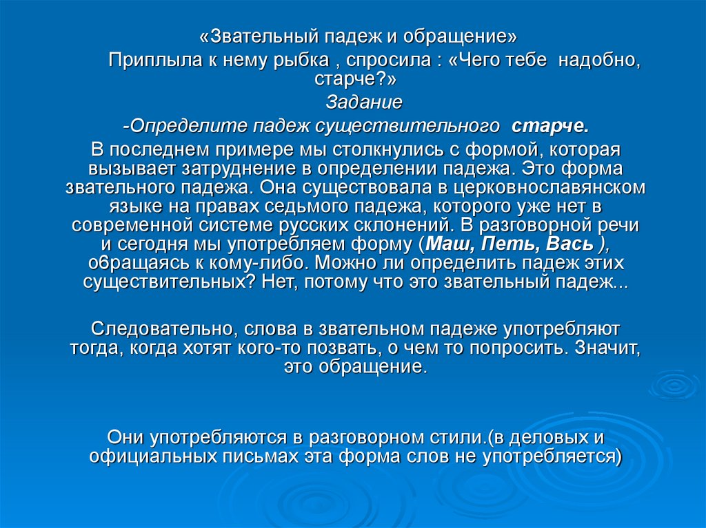 «Звательный падеж и обращение»Приплыла к нему рыбка , спросила : «Чего тебе надобно,