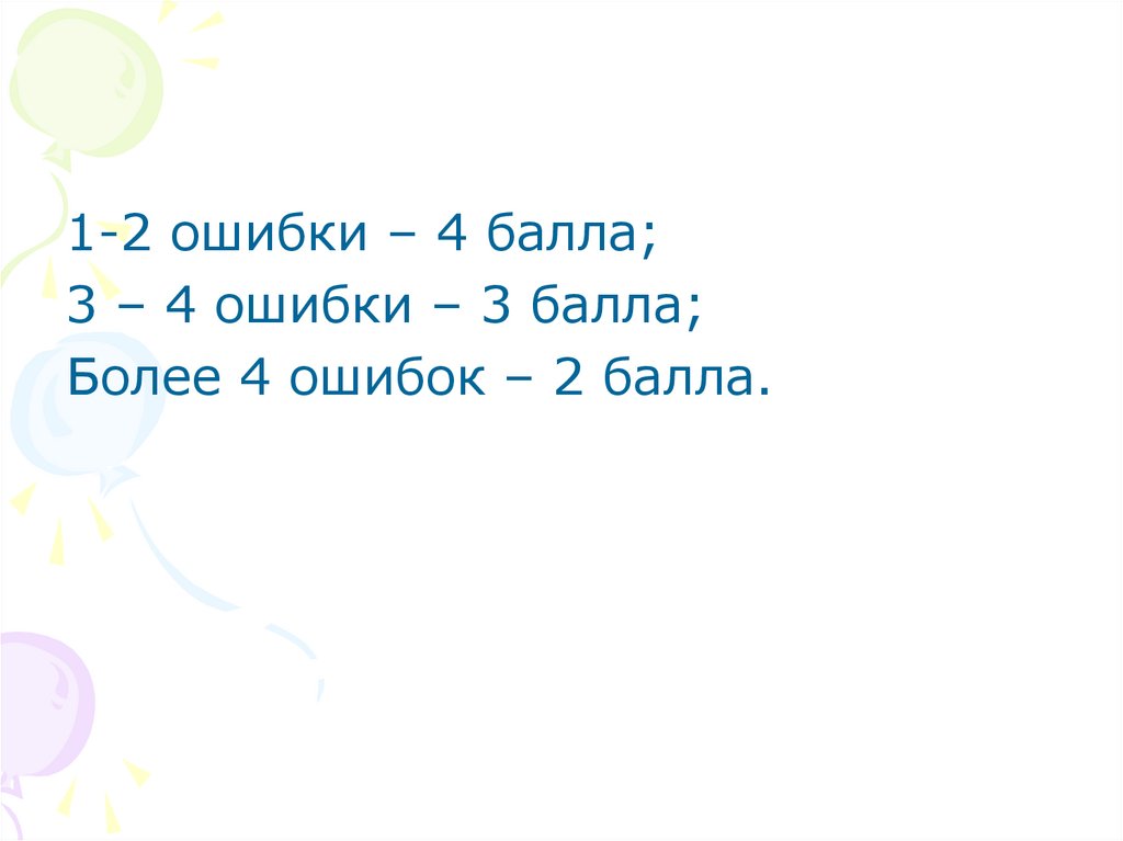 1-2 ошибки – 4 балла;3 – 4 ошибки – 3 балла;