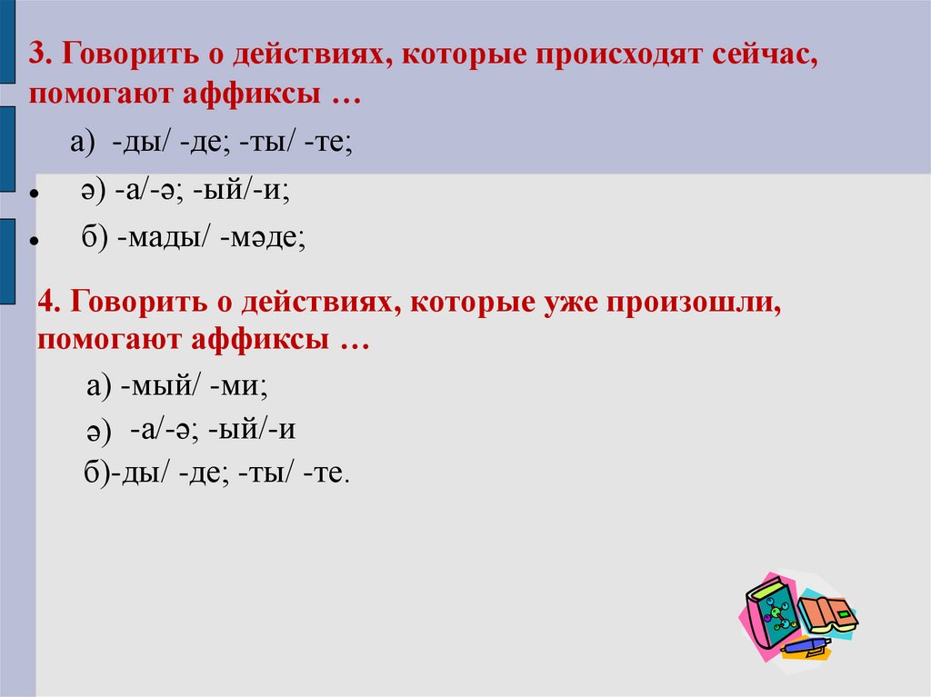 3. Говорить о действиях, которые происходят сейчас,помогают аффиксы …