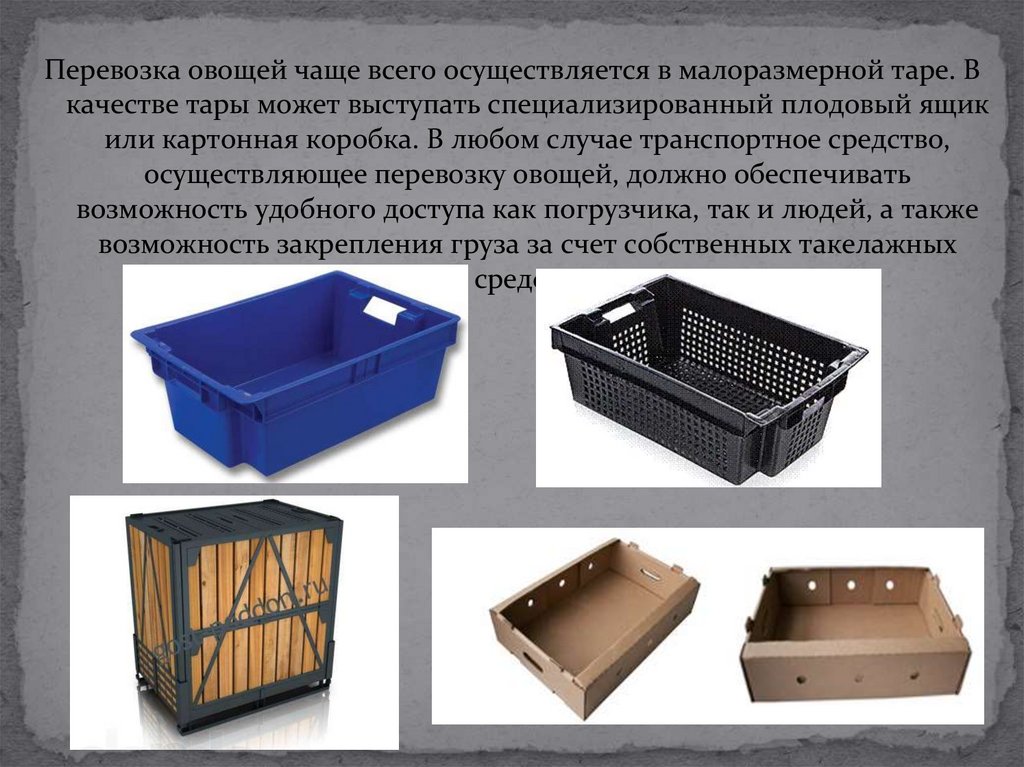 Перевозка овощей чаще всего осуществляется в малоразмерной таре. Вкачестве тары может выступать специализированный плодовый ящик