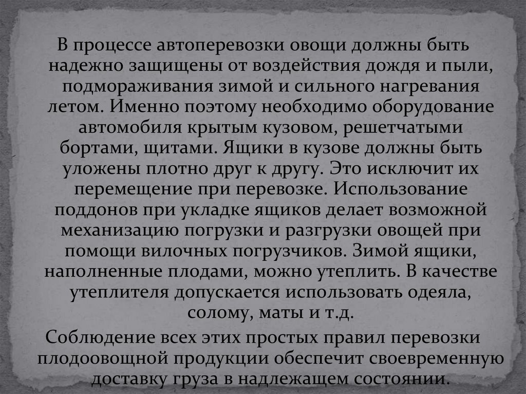 В процессе автоперевозки овощи должны бытьнадежно защищены от воздействия дождя и пыли,