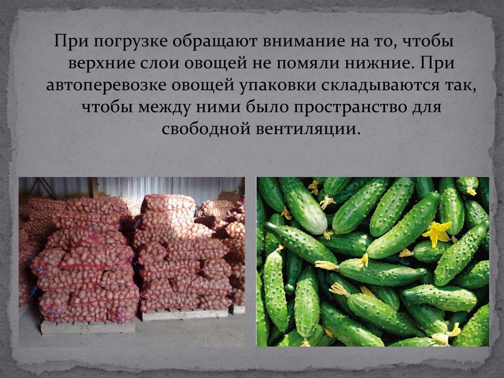 При погрузке обращают внимание на то, чтобыверхние слои овощей не помяли нижние. При