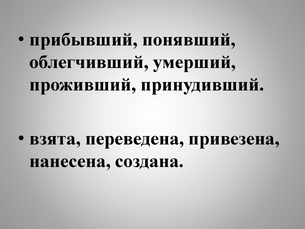 • прибывший, понявший,облегчивший, умерший,