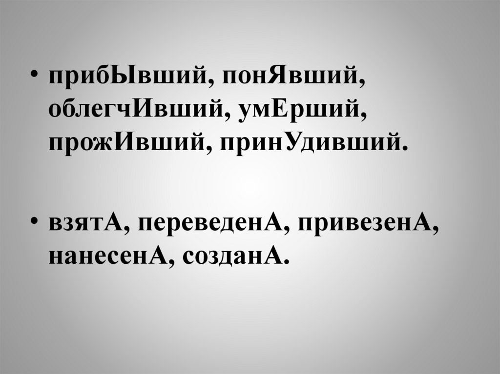 • прибЫвший, понЯвший,облегчИвший, умЕрший,