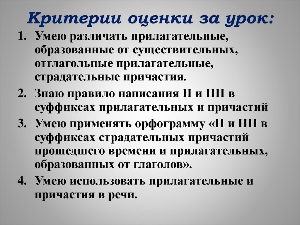 Критерии оценки за урок:1. Умею различать прилагательные,