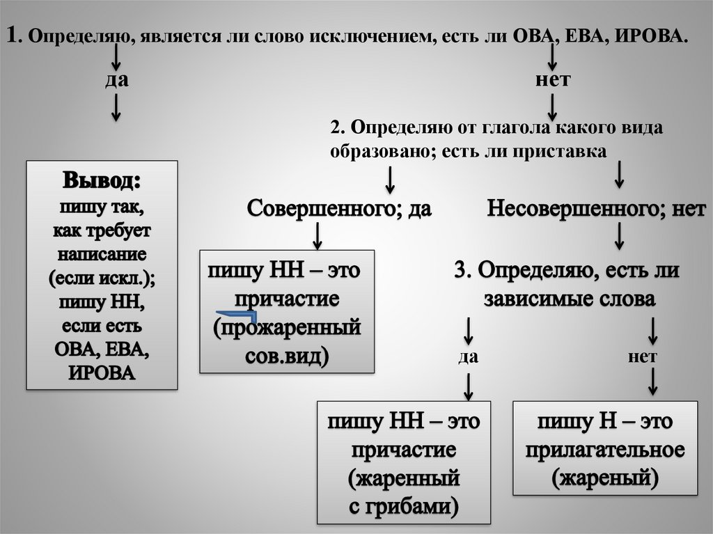 1. Определяю, является ли слово исключением, есть ли ОВА, ЕВА, ИРОВА.да