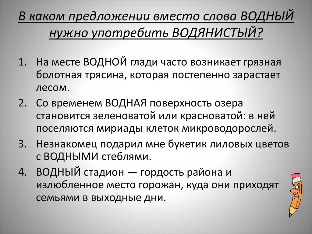 В каком предложении вместо слова ВОДНЫЙнужно употребить ВОДЯНИСТЫЙ?