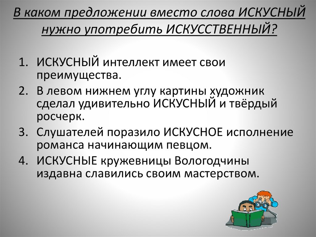 В каком предложении вместо слова ИСКУСНЫЙнужно употребить ИСКУССТВЕННЫЙ?