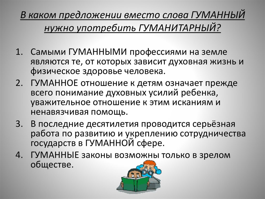 В каком предложении вместо слова ГУМАННЫЙнужно употребить ГУМАНИТАРНЫЙ?