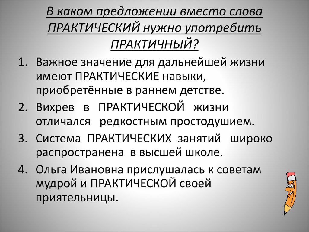 В каком предложении вместо словаПРАКТИЧЕСКИЙ нужно употребить