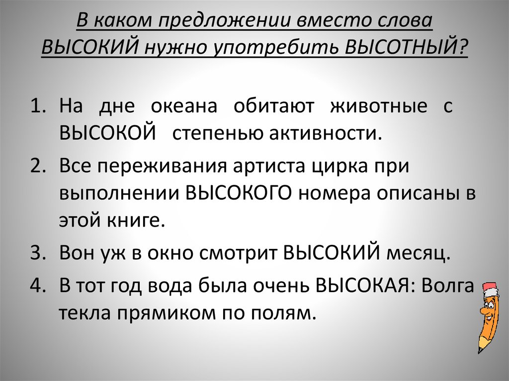 В каком предложении вместо словаВЫСОКИЙ нужно употребить ВЫСОТНЫЙ?