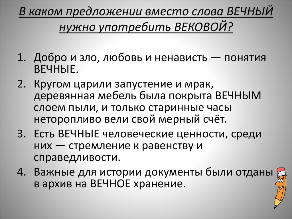 В каком предложении вместо слова ВЕЧНЫЙнужно употребить ВЕКОВОЙ?