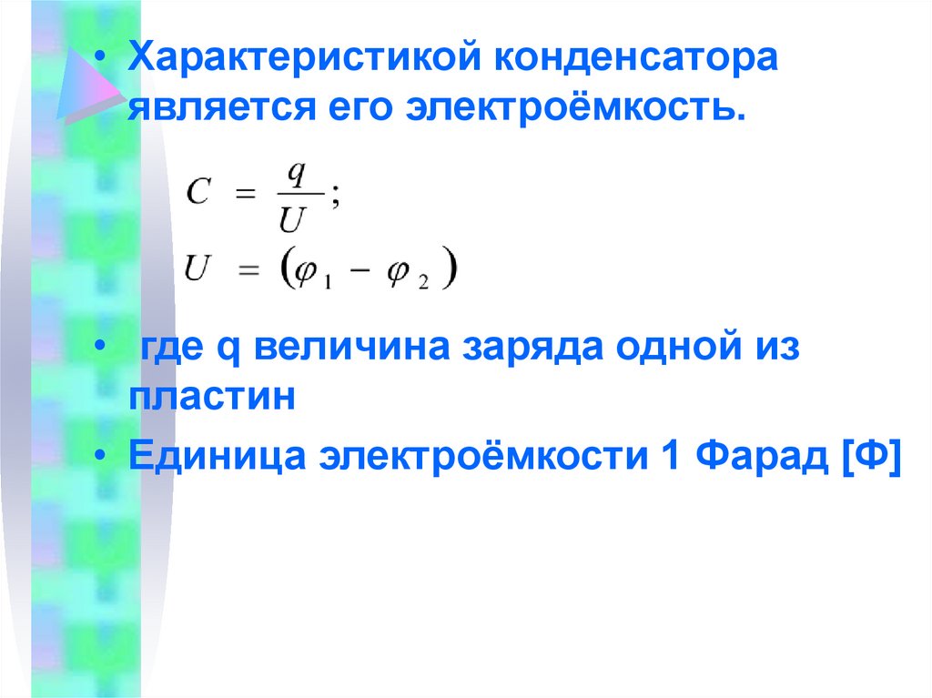 • Характеристикой конденсатораявляется его электроёмкость.