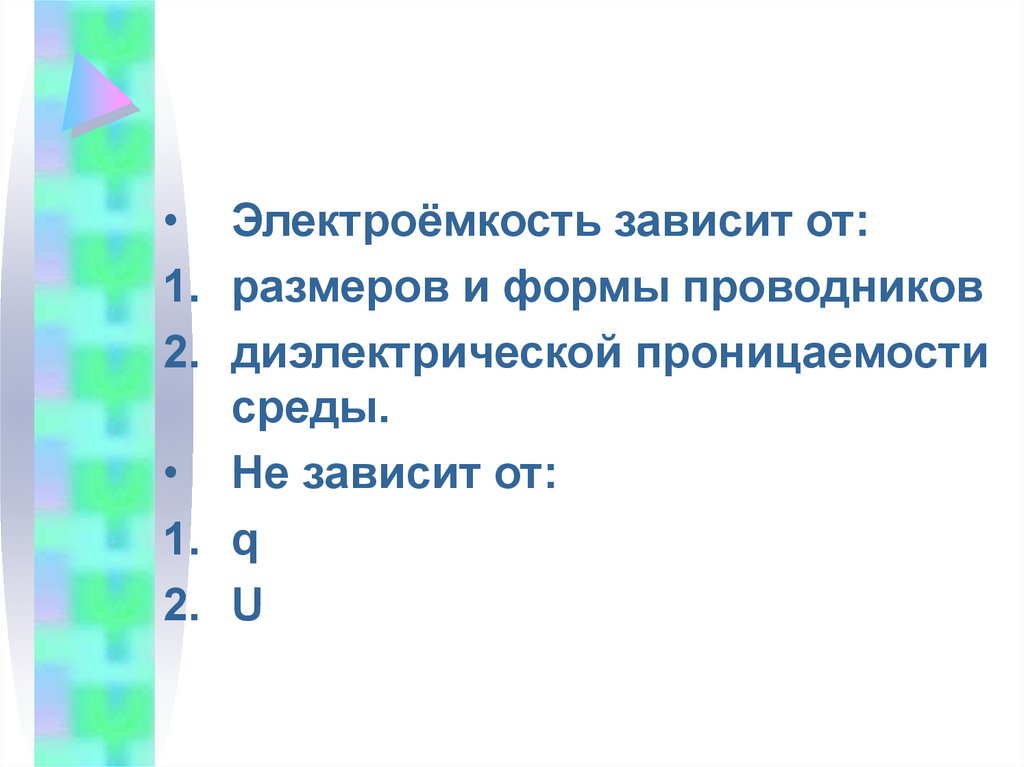 • Электроёмкость зависит от:1. размеров и формы проводников