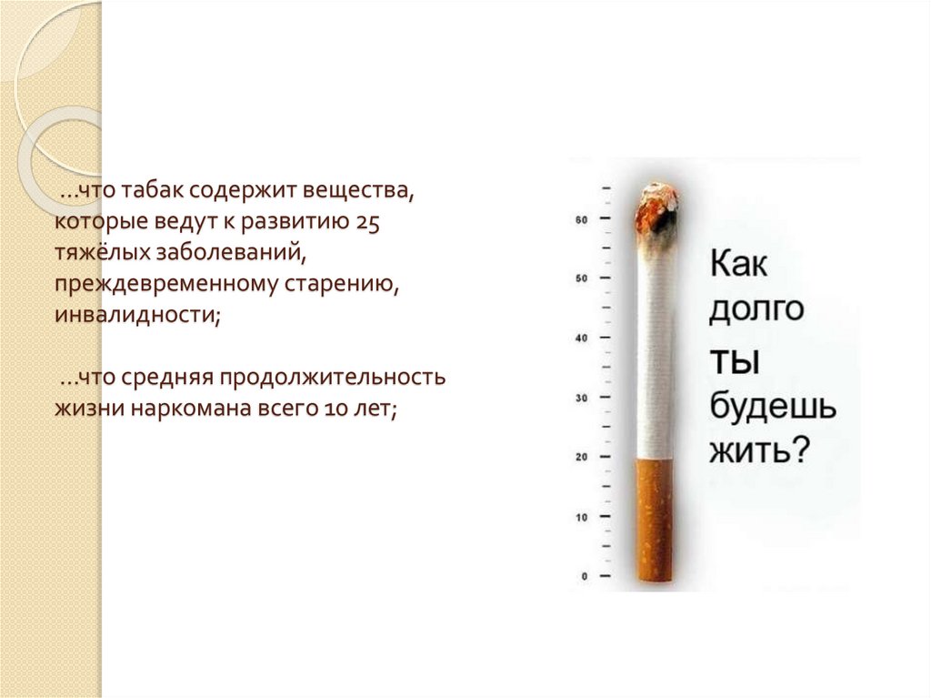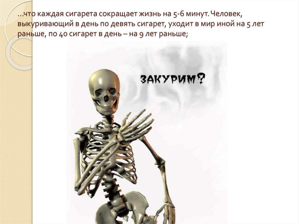 …что каждая сигарета сокращает жизнь на 5-6 минут. Человек,выкуривающий в день по девять сигарет, уходит в мир иной на 5 лет