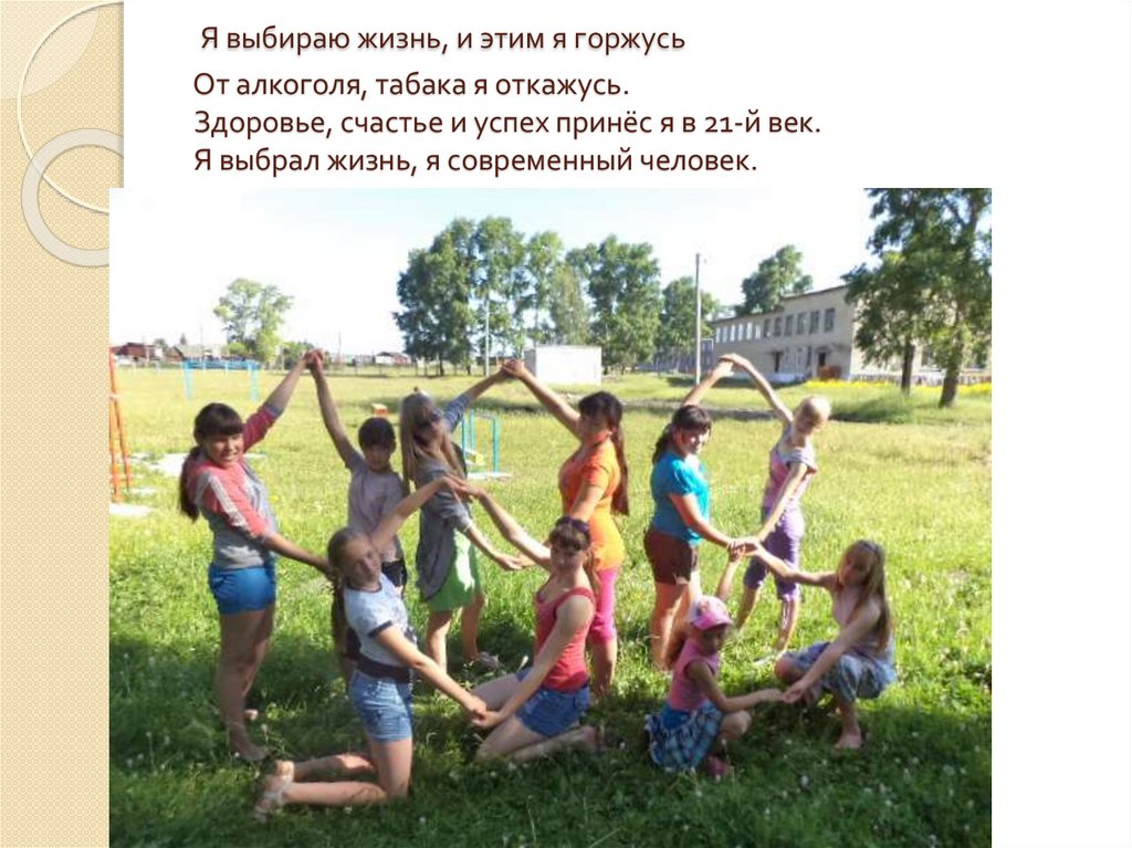 Я выбираю жизнь, и этим я горжусьОт алкоголя, табака я откажусь.