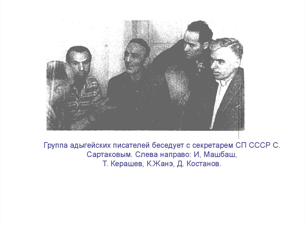 Группа адыгейских писателей беседует с секретарем СП СССР С.Сартаковым. Слева направо: И, Машбаш,