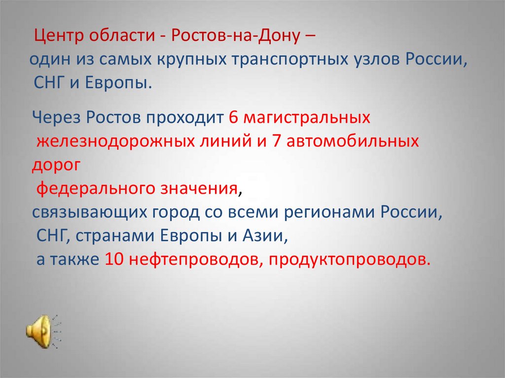 Центр области - Ростов-на-Дону –один из самых крупных транспортных узлов России,