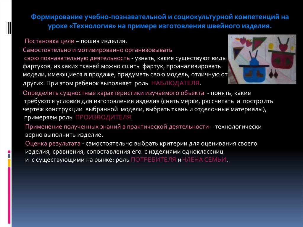 Формирование учебно-познавательной и социокультурной компетенций науроке «Технология» на примере изготовления швейного изделия.