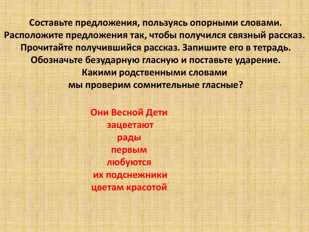 Составьте предложения, пользуясь опорными словами.Расположите предложения так, чтобы получился связный рассказ.