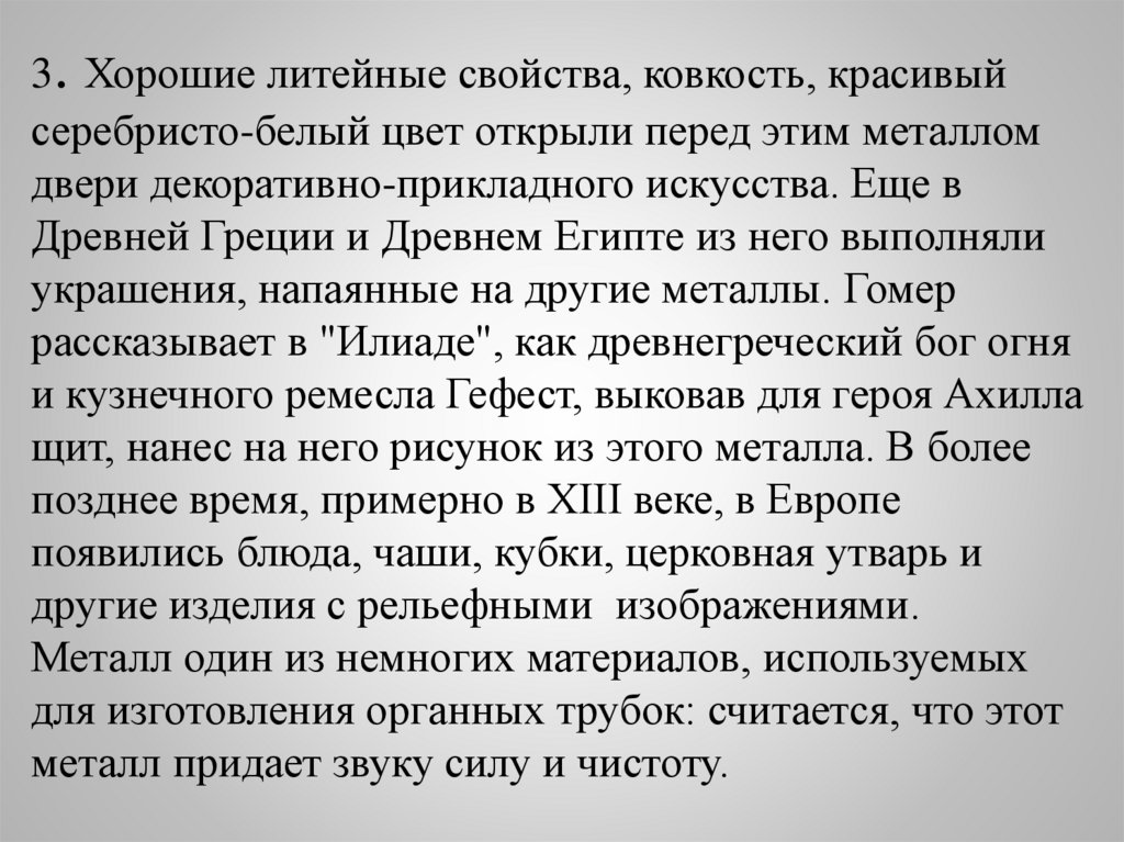 3. Хорошие литейные свойства, ковкость, красивыйсеребристо-белый цвет открыли перед этим металлом