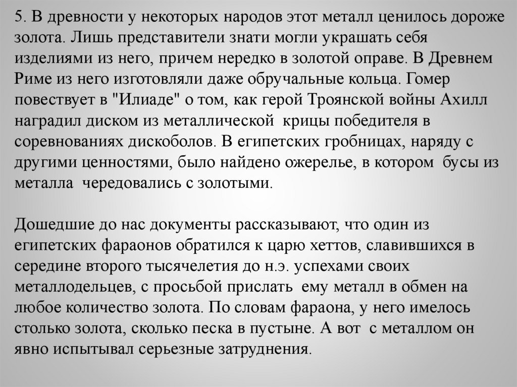 5. В древности у некоторых народов этот металл ценилось дорожезолота. Лишь представители знати могли украшать себя