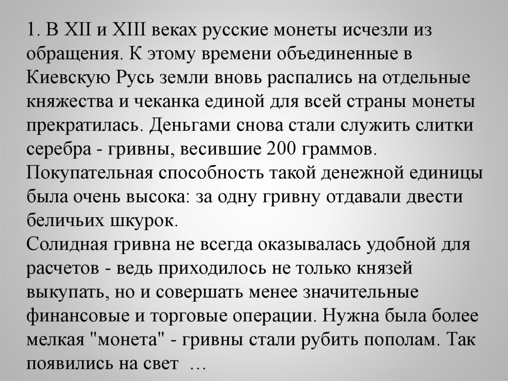 1. В XII и XIII веках русские монеты исчезли изобращения. К этому времени объединенные в